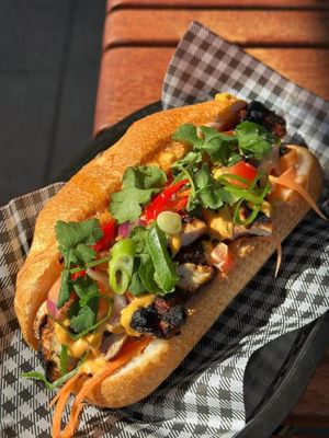 5 Spiced Pork Belly, Carrot, Cucumber, Shallots, Coriander, Chilli, Mayo, Crispy Onion and Bahn Mi Dressing.