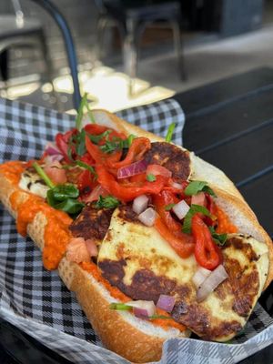 Grilled Halloumi, Romesco Sauce, Roasted Capsicum, Tomato, Onion and baby spinach.