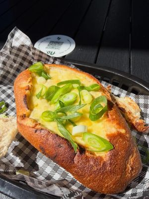 Cob Roll loaded with 3 cheeses, brisket, bacon and caramelised onion.
